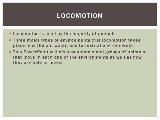 Three major types of environments that locomotion takes place in is the air water and terrestrial environments.